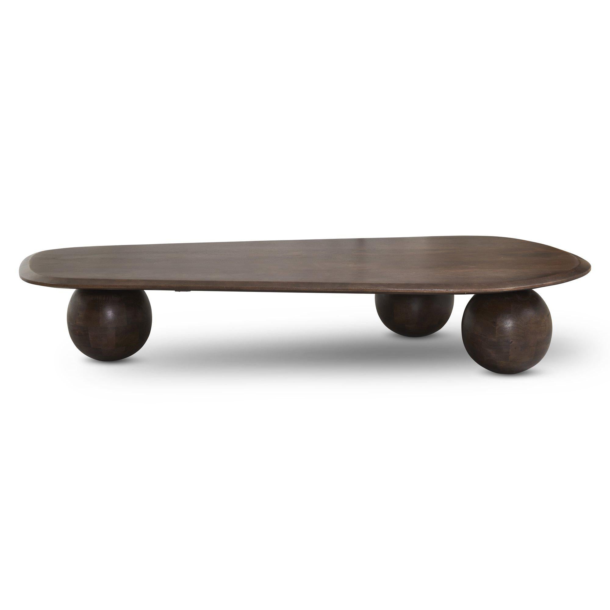 Sphere är ett imponerande statement-bord i mangoträ, formgivet i en unik och organisk form med mjukt rundade kanter. Med måtten 155x80x10.75 cm blir detta bord inte bara en funktionell möbel utan också en stilfull och unik detalj i ditt hem. Sphere har tre klot som ben vilket bara adderar till dess spännande look och design, något som verkligen gör att det drar blickar till sig. Mangoträets naturliga skönhet och värme lyser igenom bordet, och dess form ger en modern twist som känns lekfull och levande. Rundningen av kanterna lägger till en mjukhet och elegans till bordets design, vilket gör bordet riktigt lyxigt och till ett riktigt ögongodis. Skötselråd: Bordet ska endast rengöras med en torr trasa.