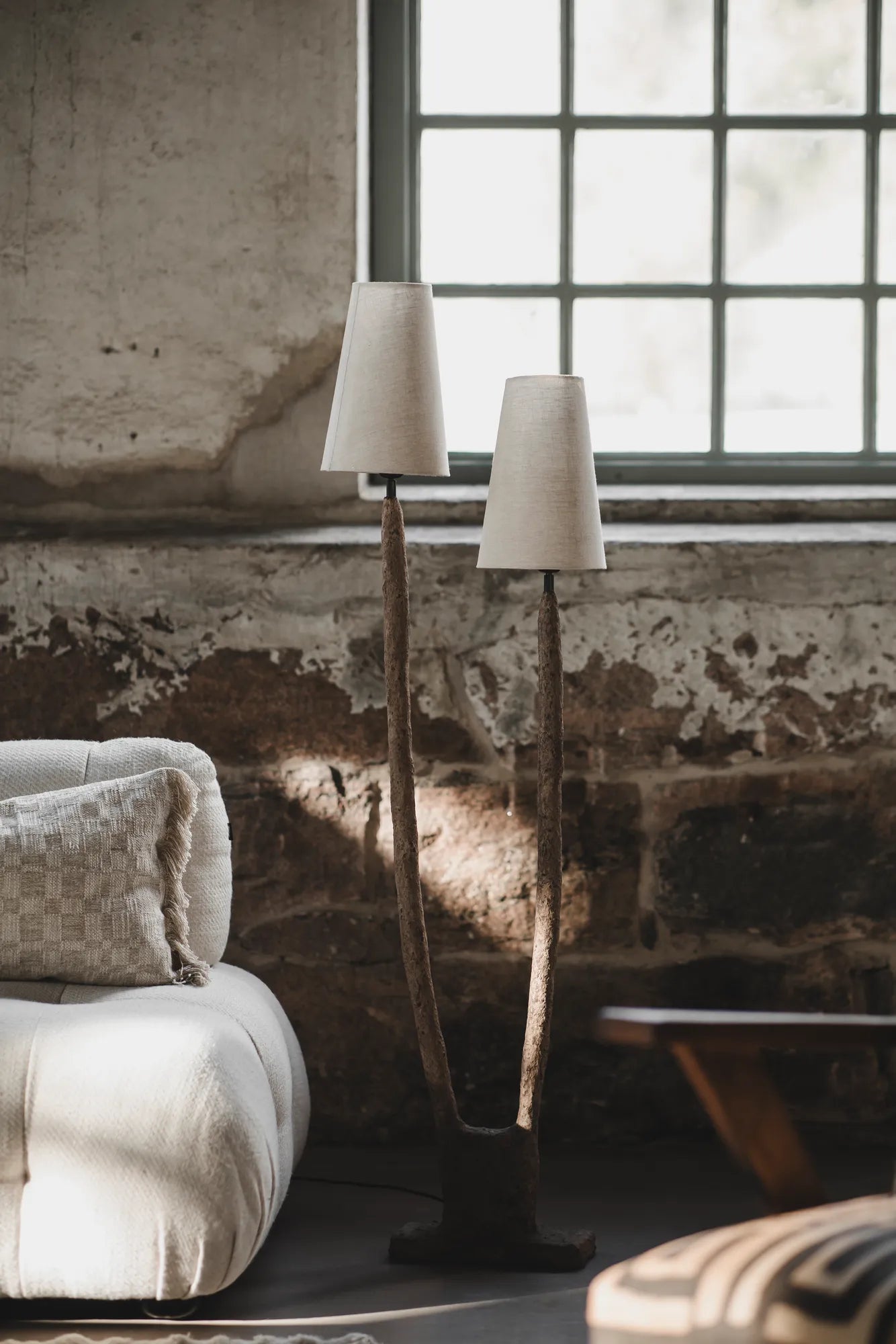 Fungu är en riktigt unik golvlampa som kombinerar konstnärlig design med naturlig inspiration. Lampan har en fot som delas i två grenliknande strukturer vilket leder till två lampor på vardera sida. Lampan har ett skulpturalt uttryck som är direkt hämtat från naturens former. Tillverkad av papier-mâché och med lampskärmar av linne, ger Fungu en harmonisk förening av hållbarhet och estetik. Denna lampa är inte bara en ljuskälla utan också en konstnärlig detalj som lyfter fram rummets atmosfär med sitt mjuka och varma ljus. Med sin unika design och materialval är Fungu en perfekt balans mellan funktion och skönhet, vilket gör den till en uppskattad del av din inredning. Ett riktigt statement piece!