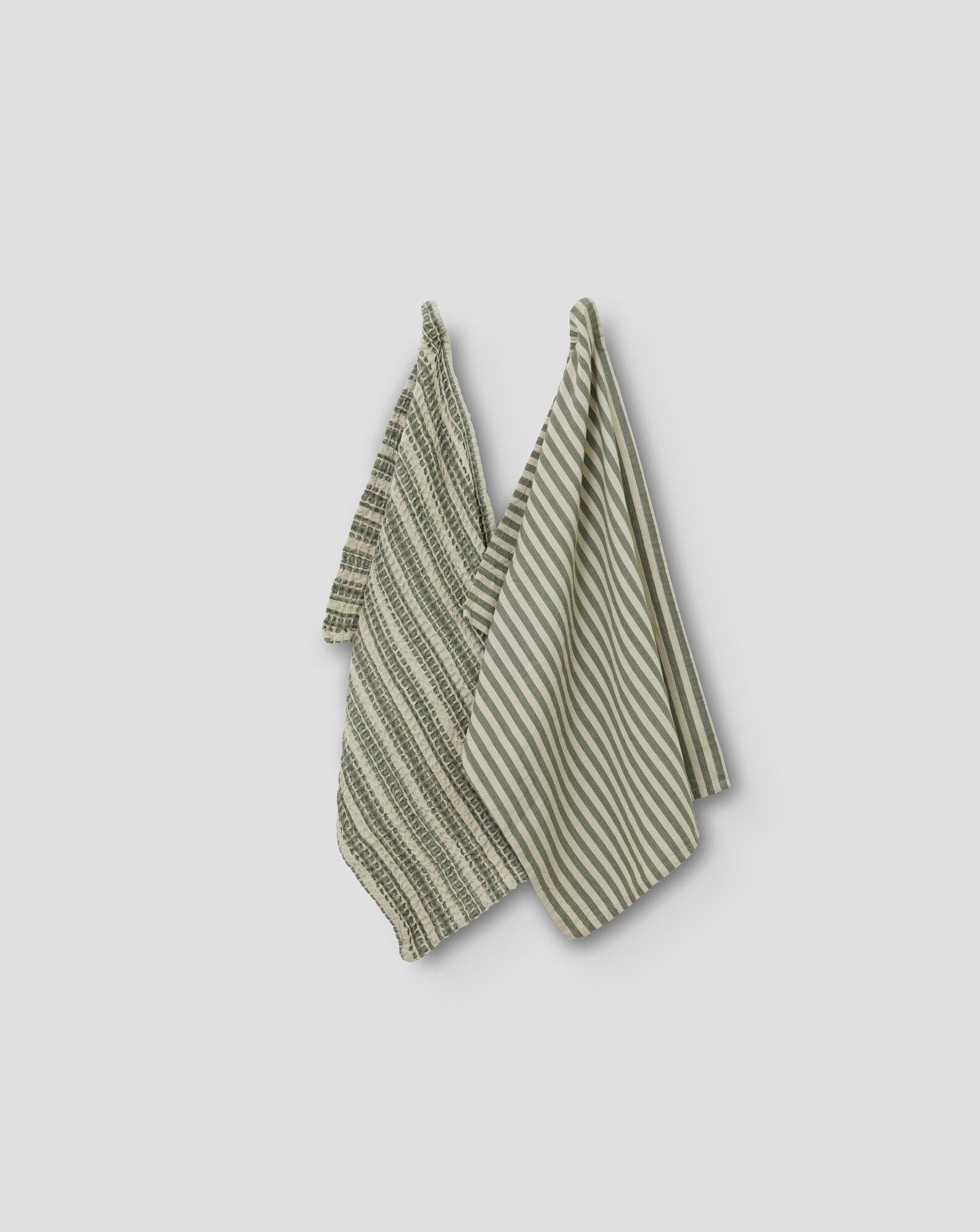 Ge ditt kök både stil och funktion med Cuisine, ett vackert set av två tidlösa kökshanddukar som tillsammans skapar en inbjudande och livfull atmosfär. Med sina gröna ränder och noggrant utvalda texturer, är Cuisine både en praktisk och dekorativ detalj som kompletterar din köksinredning på ett harmoniskt sätt. Setet består av två handdukar - den ena vävd i en enkel och stilren design, medan den andra har en våfflad struktur som ger en taktil känsla. De gröna ränderna är klassiska och tidlösa, och passar lika bra i ett lantligt kök som i ett mer modernt hem.