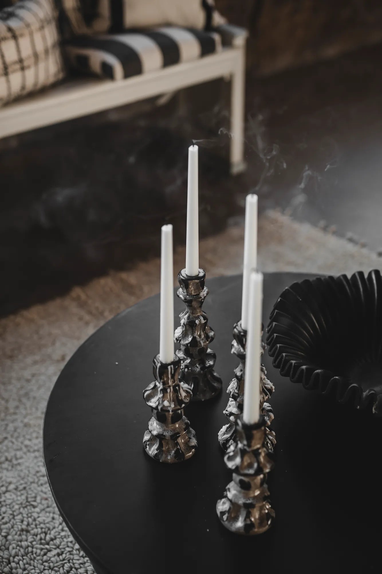 Upptäck Tulip ljusstake, en unik och konstnärlig detalj som kombinerar minimalistisk design med naturlig skönhet. Den abstrakta formen på denna ljusstake gör den till ett iögonfallande konstverk, medan den handmålade finishen och den reaktiva glasyrens subtila färgskiftningar ger varje exemplar en personlig och oersättlig karaktär. Varje ljusstake är en hyllning till det handgjorda hantverket, och ingen är den andra lik. De vackra ränderna och de mjuka färgövergångarna skapar ett dynamiskt uttryck som både ger energi och lugn till ditt hem.