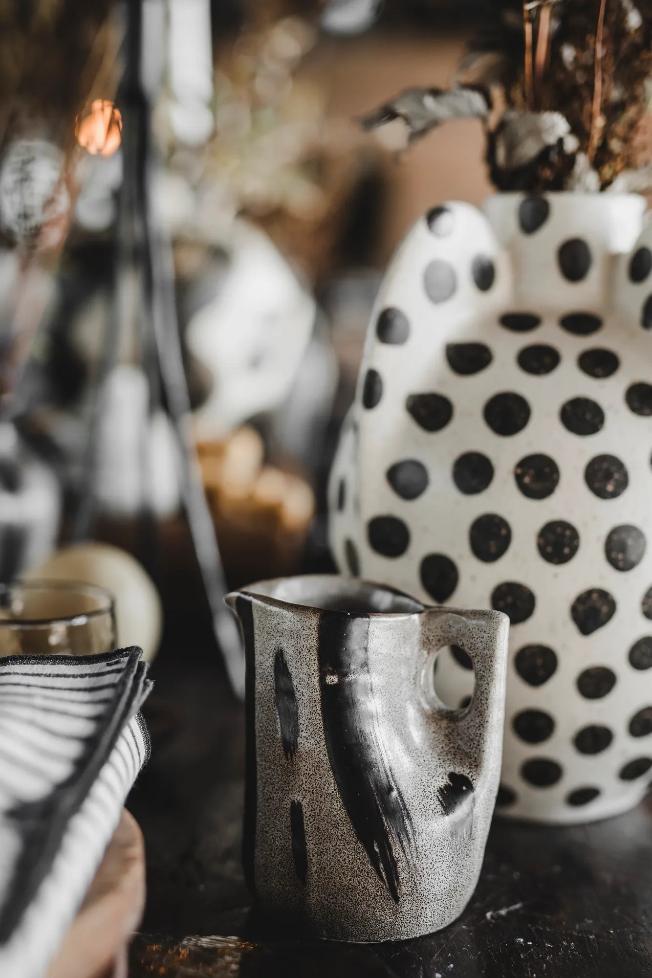 Upptäck Tulip tillbringare, en elegant och tidlös serveringsdetalj som kombinerar det bästa av minimalistisk design och naturlig skönhet. Tillverkad i stengods och belagd med reaktiv glasyr, får varje kanna en unik finish. Den reaktiva glasyren skapar subtila färgskiftningar som gör varje exemplar helt oersättligt och förvandlar varje kanna till ett litet konstverk. Ingen kanna är den andra lik - varje detalj, varje skiftning i färg, är ett resultat av det handgjorda hantverket som ger en levande och personlig känsla. Med sitt mjukt randiga mönster och jordnära toner förmedlar Tulip en värme och enkelhet som passar perfekt i både moderna och mer klassiska inredningar. Den minimalistiska designen framhäver den naturliga skönheten hos stengodset och ger en stilren, tidlös touch till varje måltid. De subtila, runda formerna och de harmoniska linjerna gör Tulip till en vacker och funktionell detalj som passar för alla tillfällen.
