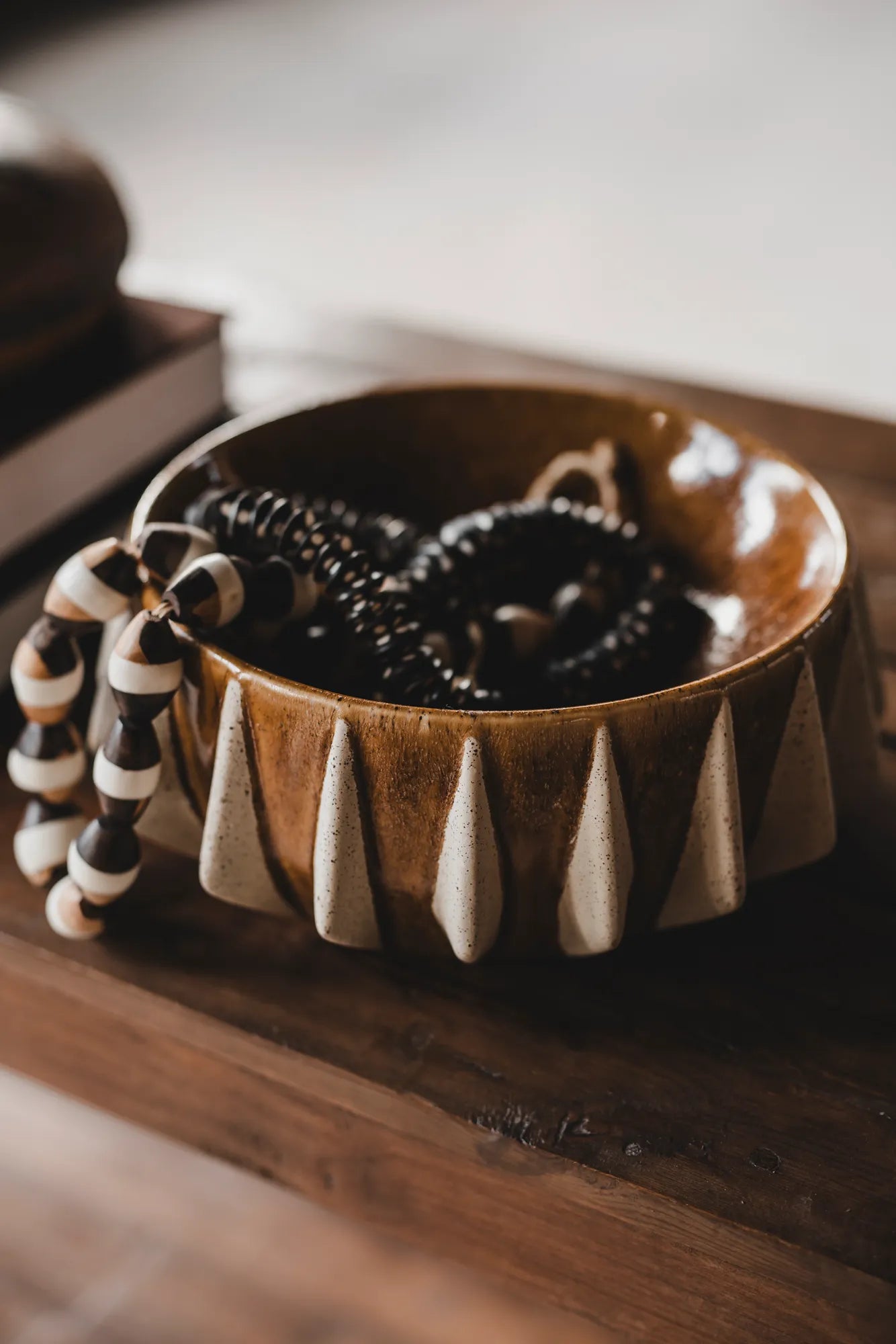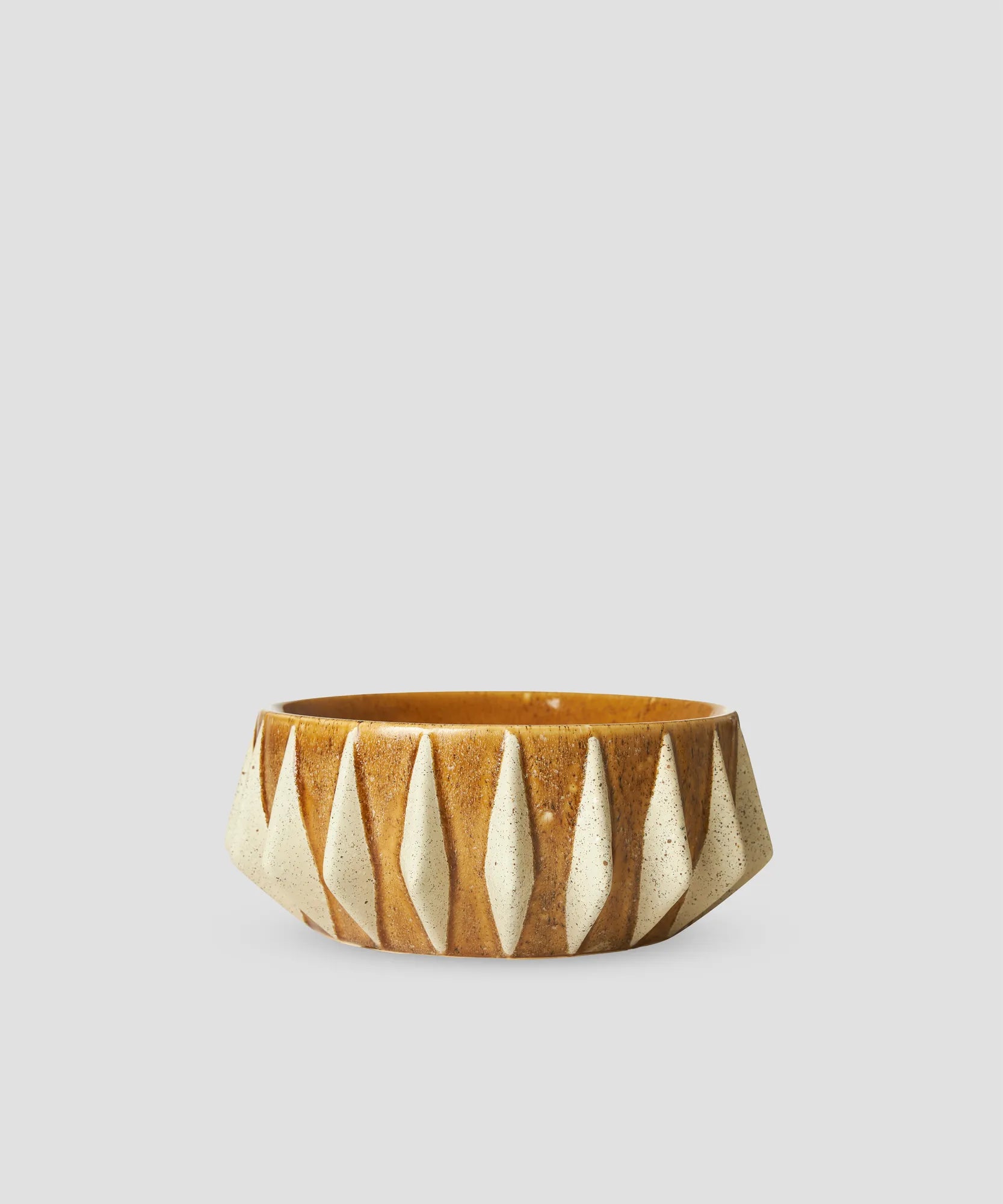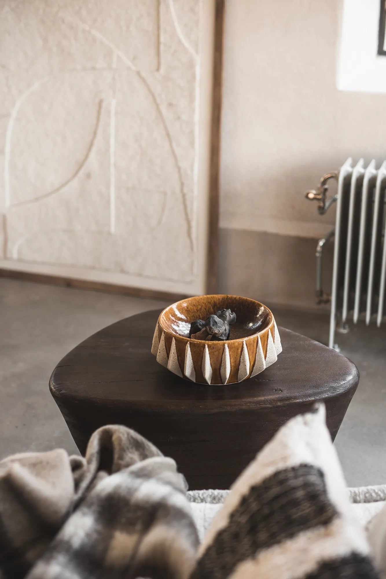 Ge ditt kök eller matbord en dos bohemisk elegans med vår stengodsskål, Jael. Med sitt unika uttryck och dekorativa trianglar som pryder runt dess yta, blir Jael en fascinerande och iögonfallande produkt som verkligen står ut som ett statement i din inredning. Jael-skålen är skulpterad med omsorg och precision från högkvalitativt stengods, vilket ger den en autentisk och robust karaktär. De dekorativa trianglarna ger skålen en konstnärlig touch och bidrar till dess bohemiska uttryck. Varje detalj är noga utformad för att skapa en enhetlig och vacker helhet.