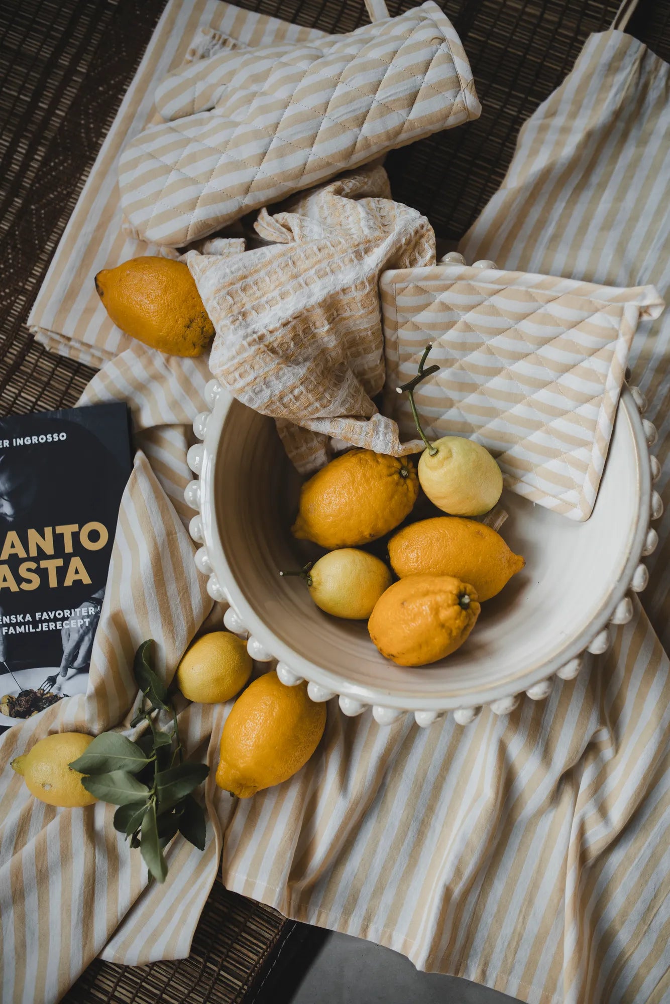 Cuisine duk är klädd i smala, gula ränder som ger bordet ett fräscht och stilrent uttryck. Det klassiska randiga mönstret för tankarna till bistrostil och skapar en inbjudande känsla oavsett om det är vardagsmiddag eller festlig dukning. Med sin tidlösa design är Cuisine lätt att matcha med både enfärgade textilier och mönstrade detaljer. En duk som förenar funktion och charm - och som gör varje måltid lite mer inspirerande.