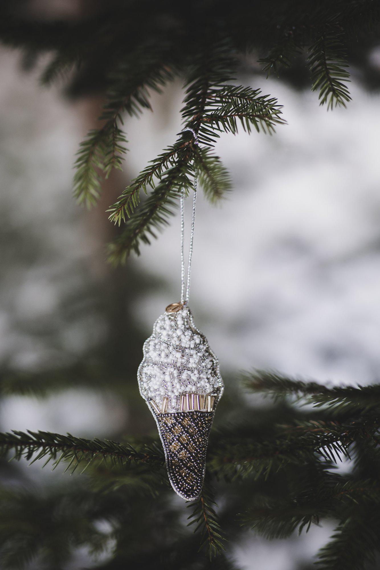 Ge din julgran en glittrande och personlig touch med detta handbroderade julgranshänge i form av en glass. Varje detalj på denna unika juldekoration är noggrant broderad för hand med glaspärlor på båda sidor, vilket ger den en vacker och elegant glans. Denna exklusiva julgransdekoration är mer än bara en dekor - det är ett konstverk som fångar julens anda med sin värme och design. Perfekt för att skapa en mysig och glittrande julstämning, kommer detta julgranshänge att bli ett minnesvärt inslag i din gran varje år. En liten skatt som sätter guldkant på julgranen.
