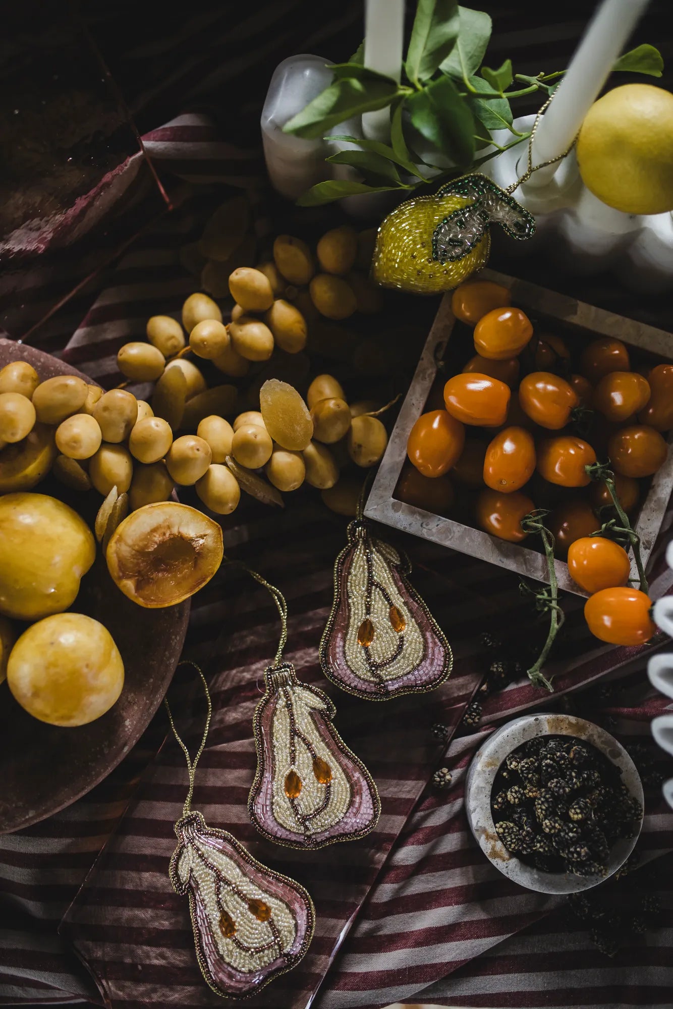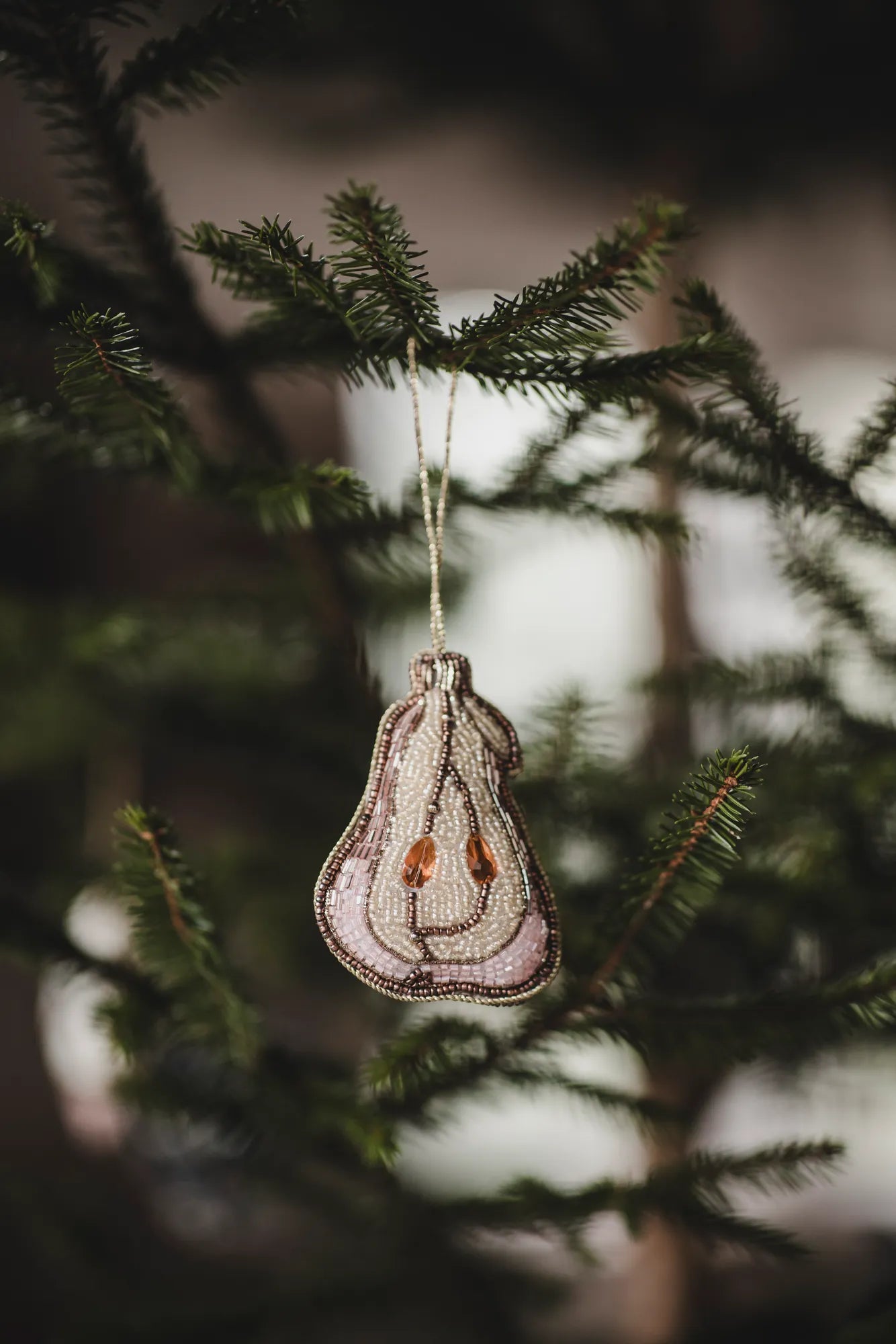Ge din julgran en glittrande och personlig touch med detta handbroderade julgranshänge i form av en grönsak. Varje detalj på denna unika juldekoration är noggrant broderad för hand med glaspärlor på båda sidor, vilket ger den en vacker och elegant glans. Denna exklusiva julgransdekoration är mer än bara en dekor - det är ett konstverk som fångar julens anda med sin värme och design. Perfekt för att skapa en mysig och glittrande julstämning, kommer detta julgranshänge att bli ett minnesvärt inslag i din gran varje år. En liten skatt som sätter guldkant på julgranen.