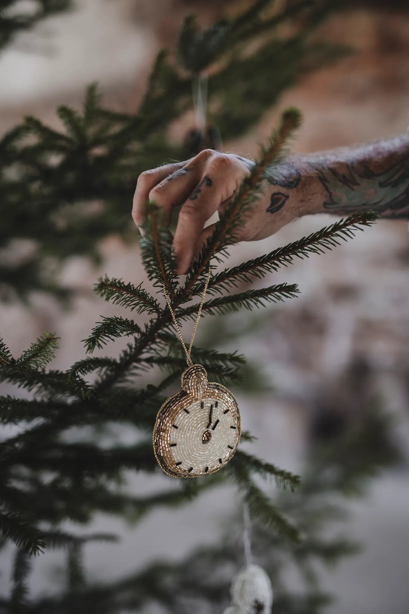 Give your Christmas tree a sparkling and personal touch with this hand-embroidered Christmas ornament in the shape of a clock. Every detail of this unique Christmas decoration is carefully hand-stitched with glass beads on both sides, giving it a beautiful and elegant shine. This exclusive ornament is more than just a decoration - it’s a piece of art that captures the spirit of Christmas with its warmth and design. Perfect for creating a cozy and glittering holiday atmosphere, this ornament will become a memorable feature in your tree each year. A little treasure that adds a touch of gold to your Christmas tree.