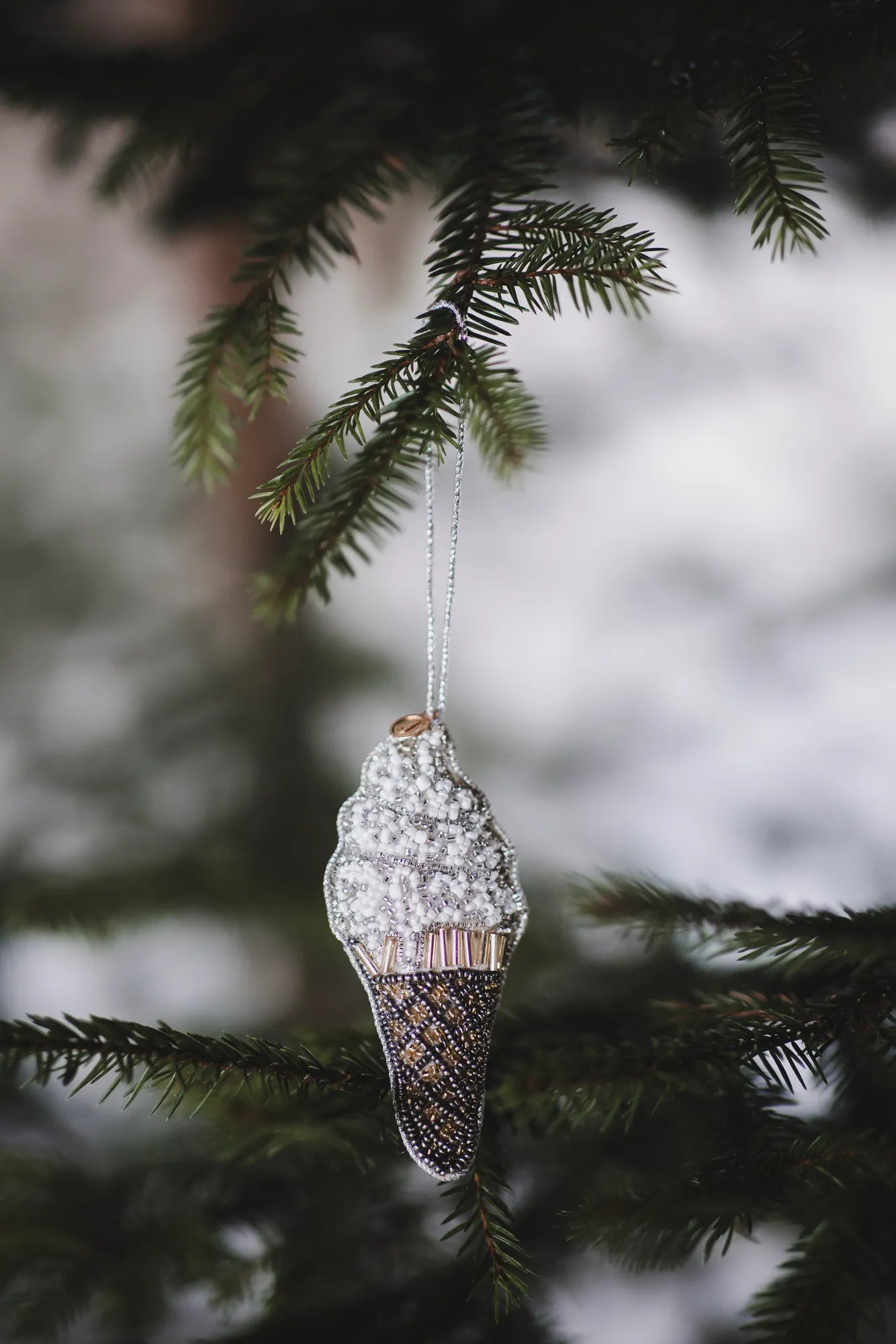 Give your Christmas tree a sparkling and personal touch with this hand-embroidered Christmas ornament in the shape of an icecream. Every detail of this unique Christmas decoration is carefully hand-stitched with glass beads on both sides, giving it a beautiful and elegant shine. This exclusive ornament is more than just a decoration - it’s a piece of art that captures the spirit of Christmas with its warmth and design. Perfect for creating a cozy and glittering holiday atmosphere, this ornament will become a memorable feature in your tree each year. A little treasure that adds a touch of gold to your Christmas tree.