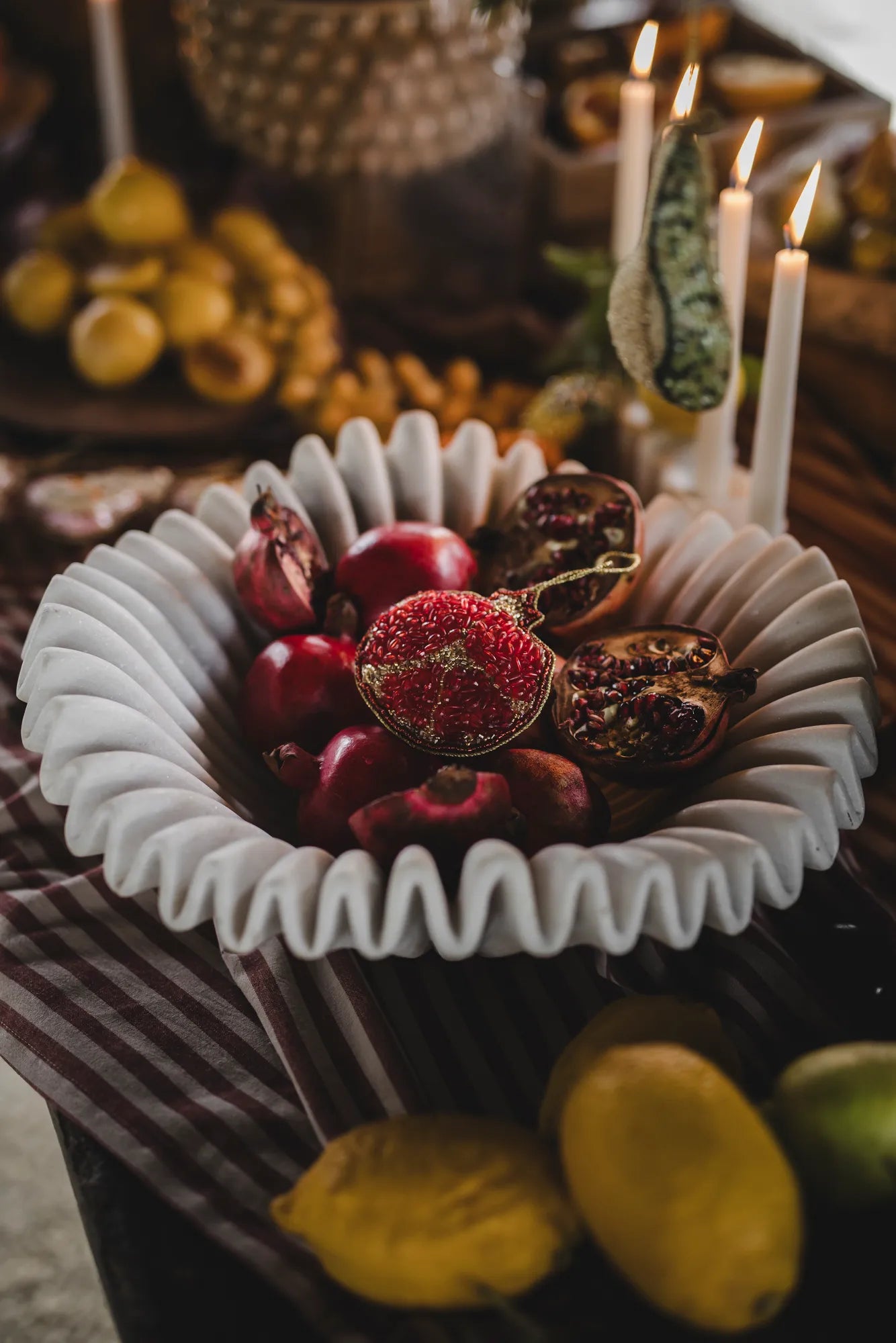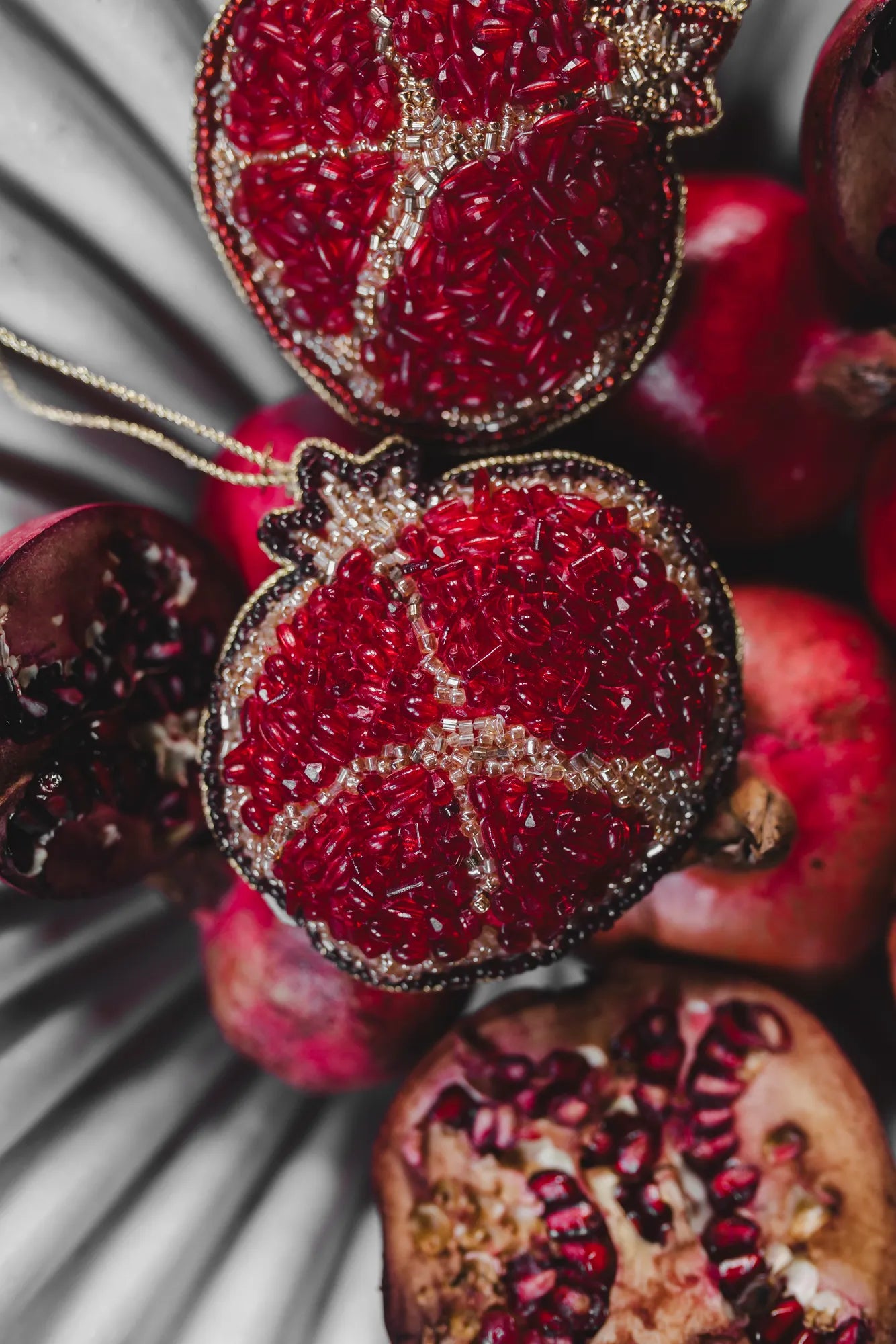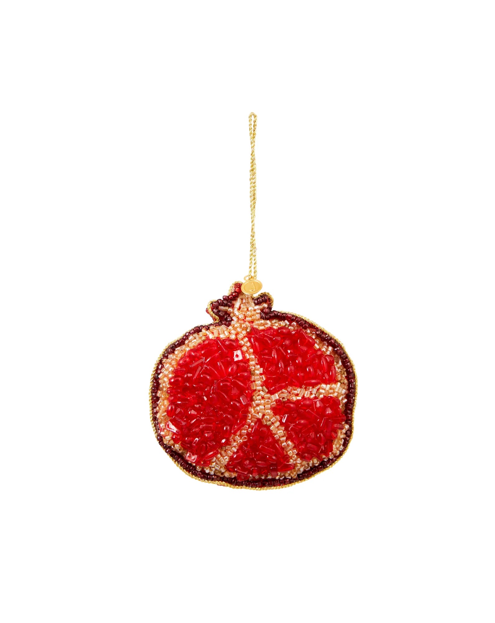 Give your Christmas tree a sparkling and personal touch with this hand-embroidered Christmas ornament in the shape of a pomegranate. Every detail of this unique Christmas decoration is carefully hand-stitched with glass beads on both sides, giving it a beautiful and elegant shine. This exclusive ornament is more than just a decoration - it’s a piece of art that captures the spirit of Christmas with its warmth and design. Perfect for creating a cozy and glittering holiday atmosphere, this ornament will become a memorable feature in your tree each year. A little treasure that adds a touch of gold to your Christmas tree.