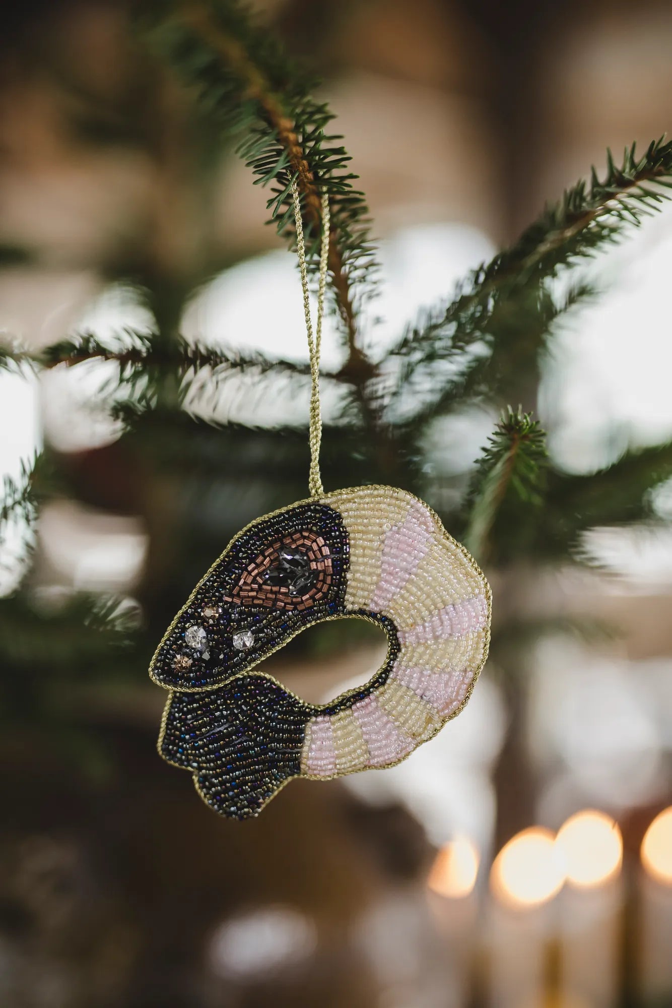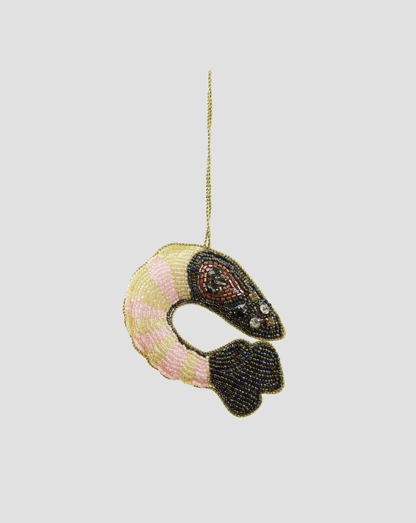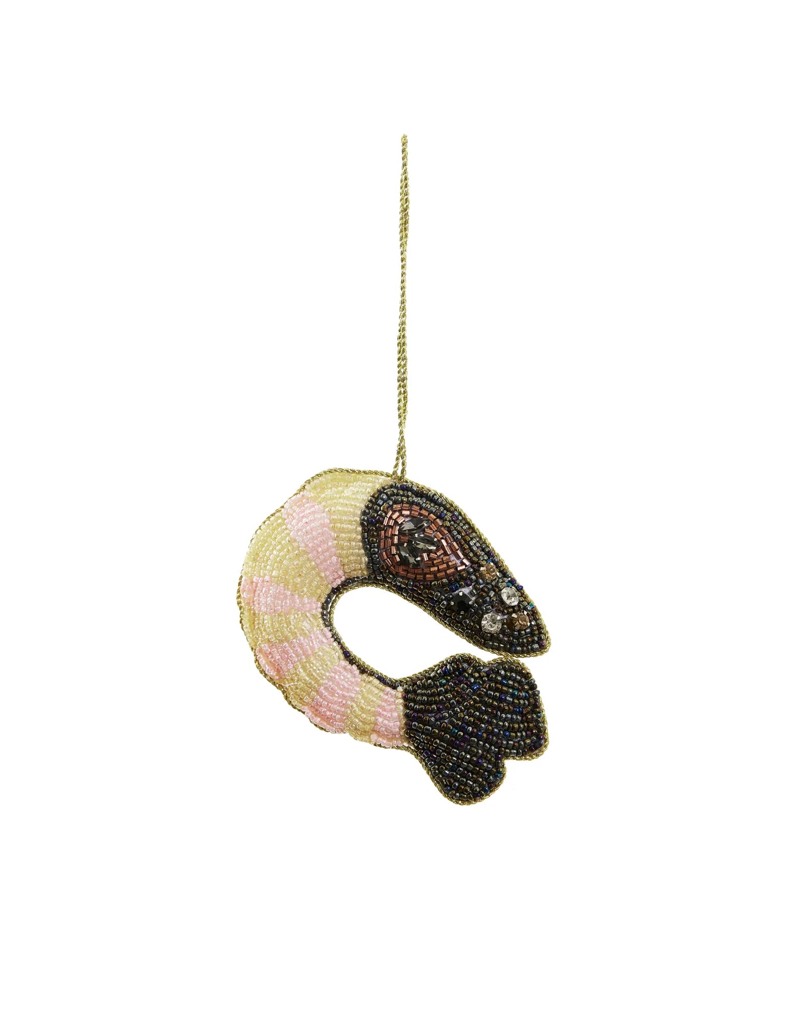 Give your Christmas tree a sparkling and personal touch with this hand-embroidered Christmas ornament in the shape of a shrimp. Every detail of this unique Christmas decoration is carefully hand-stitched with glass beads on both sides, giving it a beautiful and elegant shine. This exclusive ornament is more than just a decoration - it’s a piece of art that captures the spirit of Christmas with its warmth and design. Perfect for creating a cozy and glittering holiday atmosphere, this ornament will become a memorable feature in your tree each year. A little treasure that adds a touch of gold to your Christmas tree.