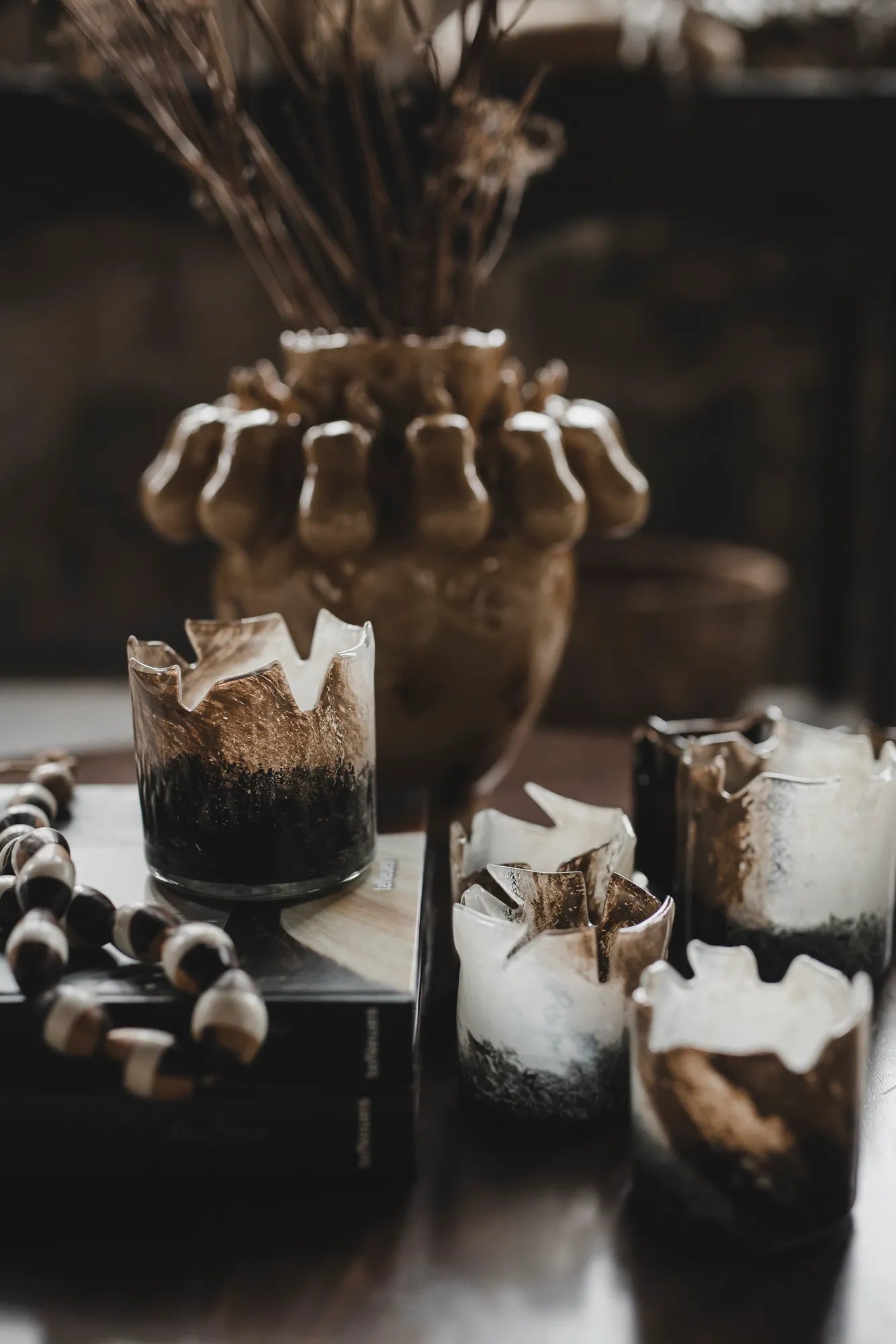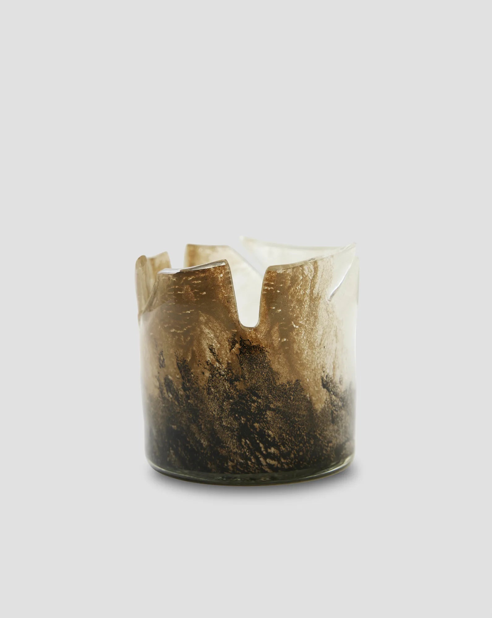 Create a warm atmosphere with the Bordo tealight holder — a handcrafted glass piece where every item is unique. The lively colour palette in earthy browns, greys, and whites gives off a soft glow and a natural feel that elevates both everyday moments and festive occasions. With its organic shape and faceted top, Bordo is as much a decorative interior detail as it is a cosy light source. Perfect to place on the coffee table, in the window, or as part of a beautiful table setting.