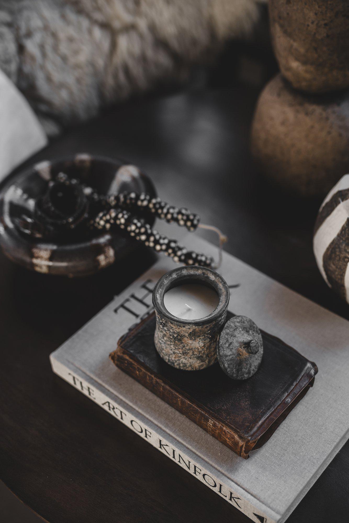 Not Quite Night scented candle fills your home with a warm, inviting fragrance of amber - sweet with hints of vanilla, myrrh, and incense. It’s a scent that both awakens the senses and creates a sense of calm, perfect for setting the mood at any time of day. The candle’s rustic stoneware container is as much a fragrance diffuser as it is a beautiful interior detail. Its charming, handcrafted feel brings character to any room - like a small piece of art standing strong in its simplicity. Perfect on a coffee table, in the bathroom, or on a bedside table - spreading both scent and a feeling of care. Infused with a fragrance concentration of 10–11%, this scented candle delivers a rich and lasting aroma that fills your space with an inviting ambiance. This scented candle is designed by the visionary creator Storm Storm. Burning hours: approx. 25 hours.