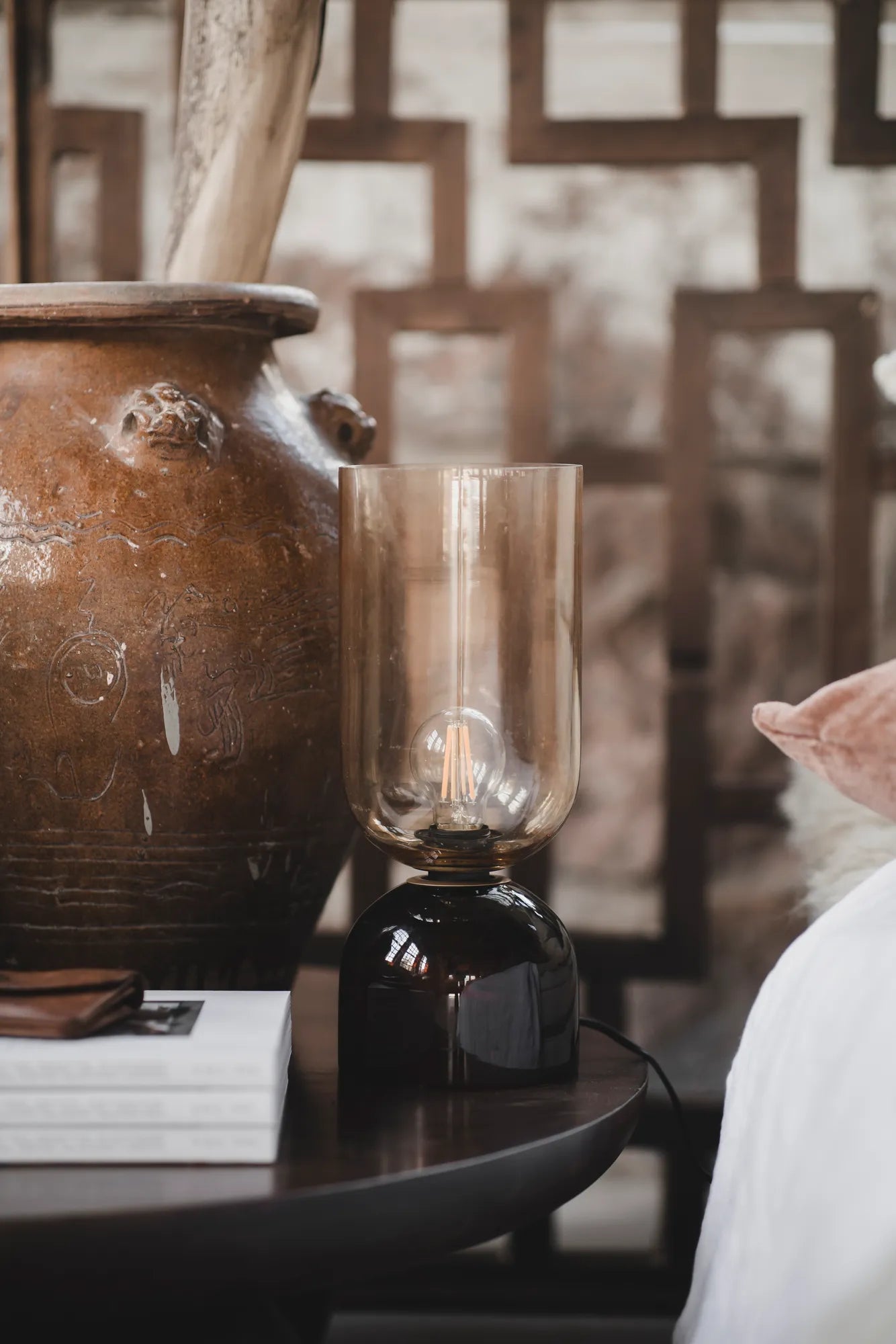 Lumine is an amber-colored glass lamp with a modern design. When the lamp is lit, it creates a soft and pleasant illumination that subtly spreads throughout the room. The warm light accentuates the details of the glass structure, providing a sense of calm and comfort. Lumine's shape, with its pillar-like structure and rounded feel, gives the lamp an artistic and contemporary character. It can easily adapt to various interior styles, from classic to contemporary. The lamp is not just a light source but also an artwork that contributes to creating an atmospheric and welcoming ambiance in every room. Specifications: E27 socket type. Max 13 watts LED. The cord is 150 cm long.