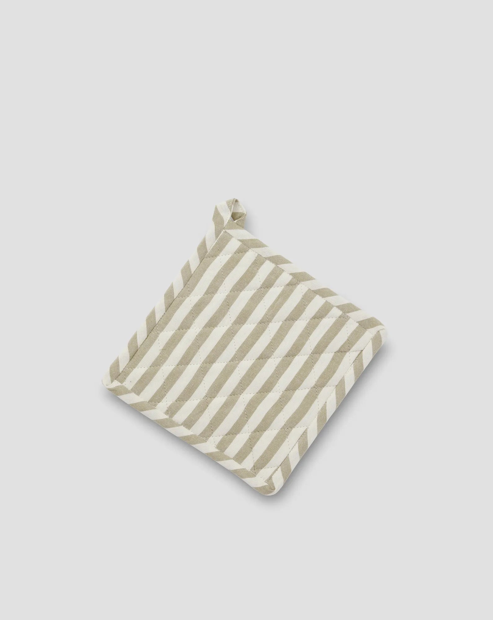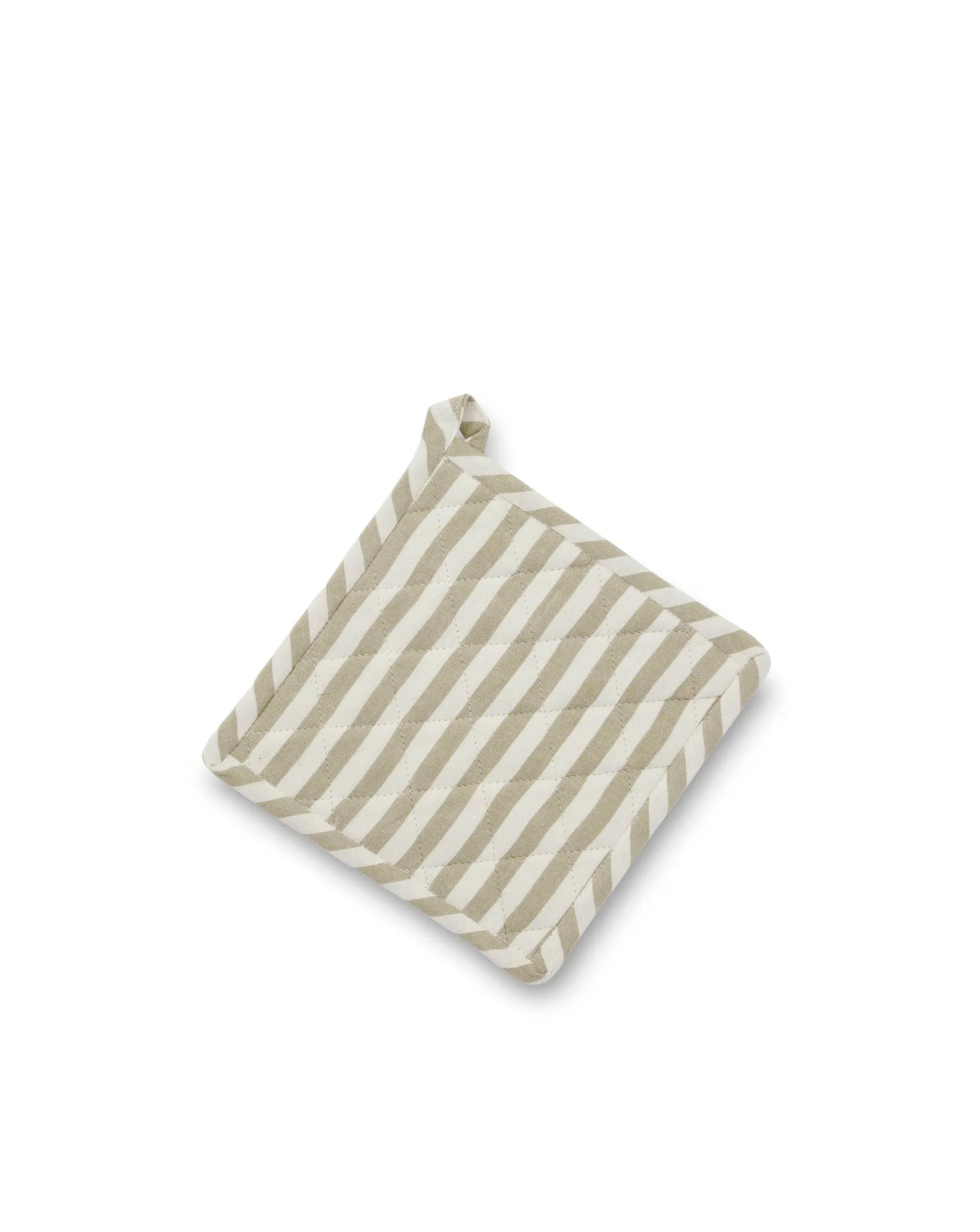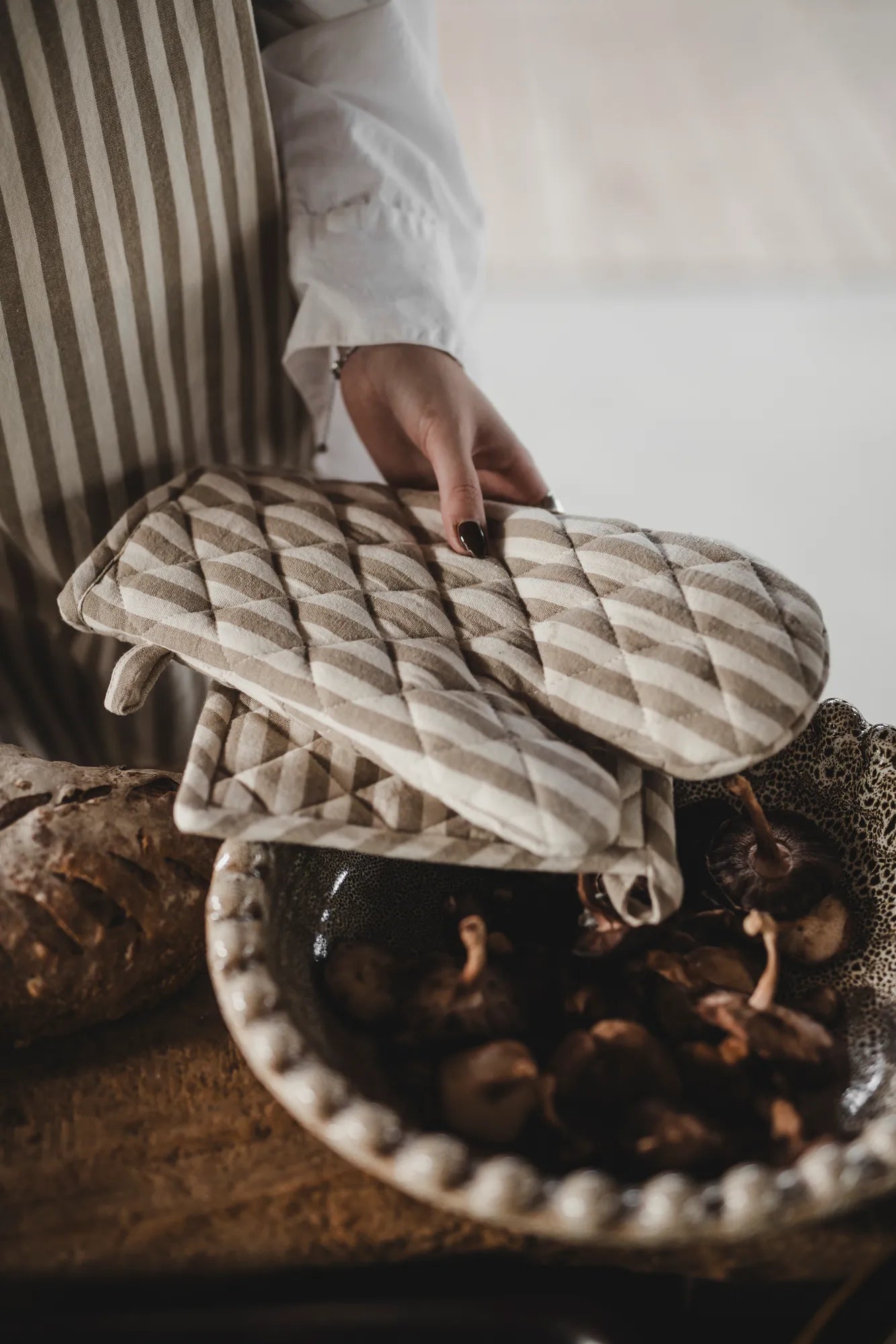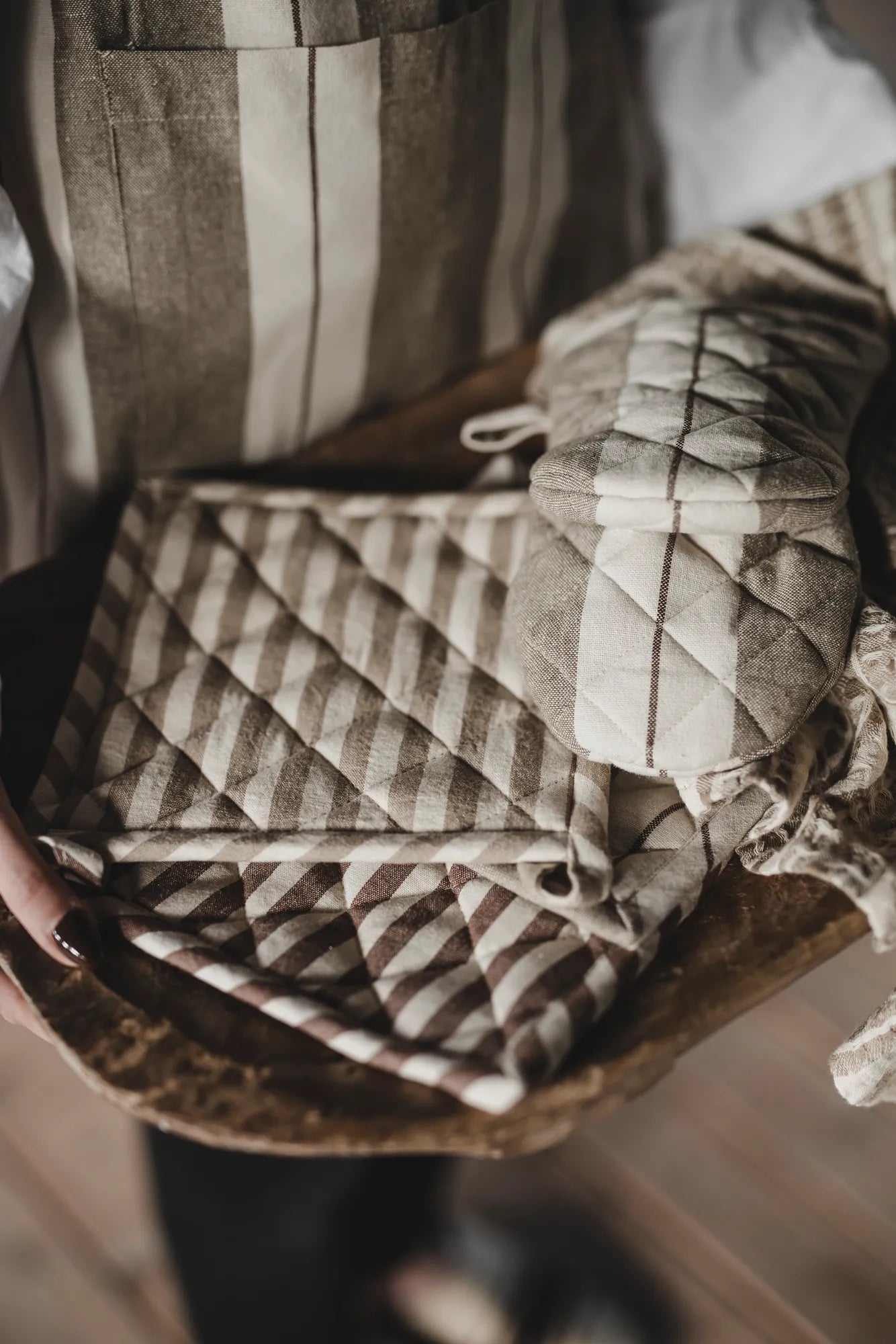 The Cuisine pot holder is adorned with slim beige stripes that bring a fresh and timeless feel to the kitchen. The classic striped pattern evokes a bistro look, making it both practical and charming. With its stylish design, it protects you during cooking and baking while adding an elegant touch to the kitchen environment. A small detail that makes a big difference in everyday life. The product is CE marked.