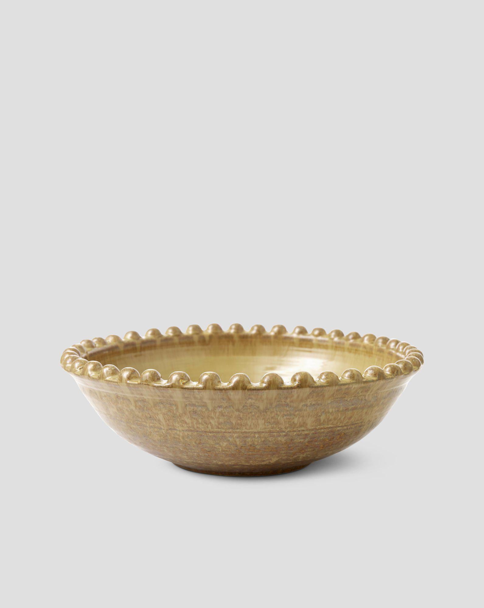 Cherie is a beautiful honey-colored ceramic bowl that exudes both warmth and charm. The edge is adorned with small bubbles, adding a playful and delightful detail that makes each bowl unique and personal. With its large and deep design, Cherie is perfect for serving fresh salads, fruit, or other delicious dishes. The bowl is not only a beautiful decoration for your table but also functional. Its size makes it ideal for both everyday meals and special occasions. Let the Cherie bowl become an elegant and charming detail in your home, creating an inviting atmosphere at every meal. A true centerpiece. The bowl is not dishwasher safe. This product is part of Jakobsdals collection together with the Norwegian interior stylist and influencer Marianne Haga Kinder.
