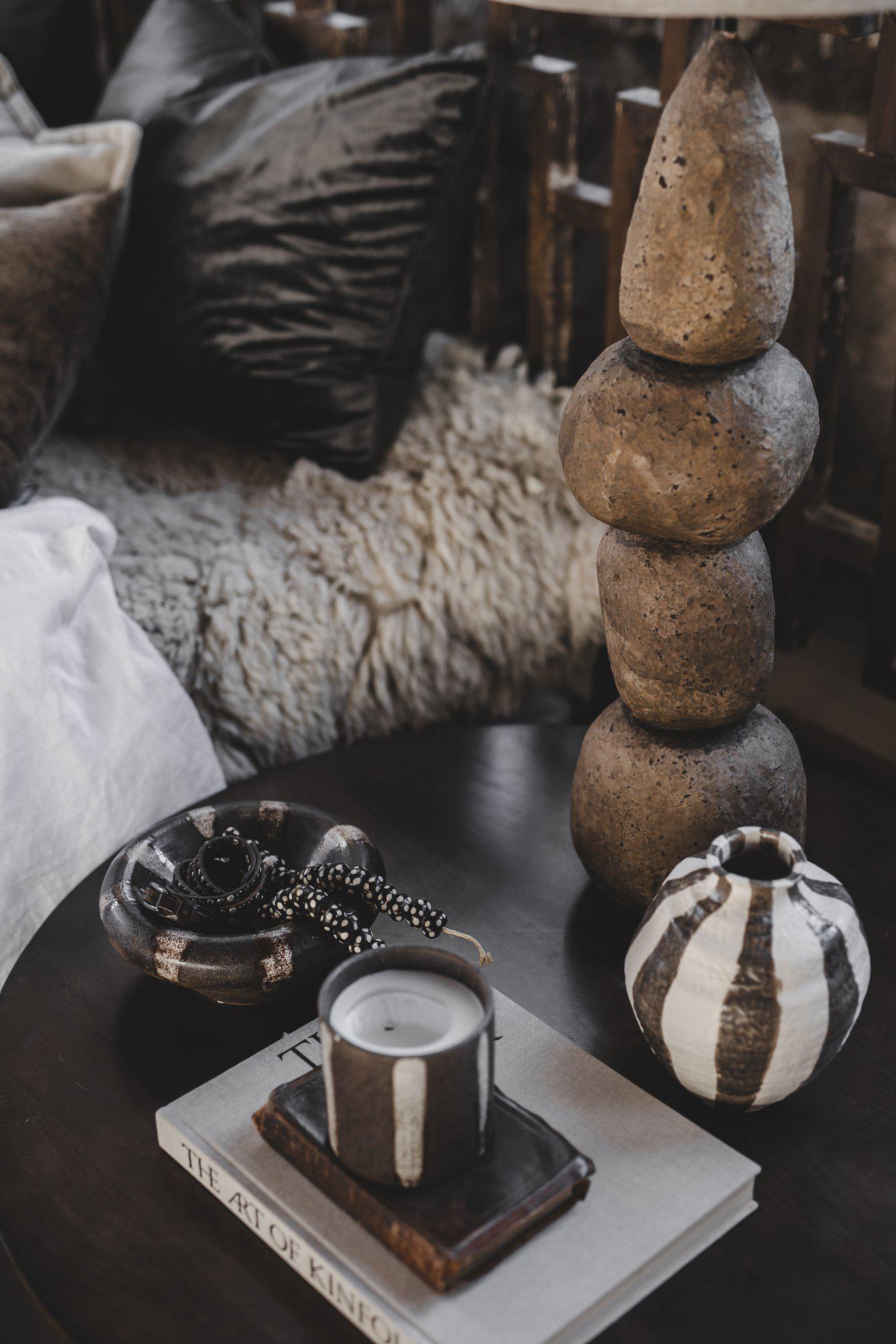 The Remi bowl is a decorative piece that exudes rustic charm and elegant beauty. With its brown and white stripes and soft, chunky shape, the bowl is a beautiful work of art that elevates any room. Hand-painted with a reactive glaze, each bowl has a unique appearance, with varying colors and finishes that make every piece one-of-a-kind. The rich depth and vibrancy of the glaze gives the bowl an authentic, handmade feel. With its rustic finish and soft design, Remi is more than just a bowl - it’s an interior detail that adds both warmth and character to your home. Perfect as a decorative element on the table, shelf, or as part of your collection of beautiful objects. The bowl is not foodsafe, making it ideal as a stylish decorative item for displaying small trinkets or creating a beautiful visual effect on shelves or tables. Let Remi be a unique and artistic addition to your home, bringing authenticity and a lively atmosphere to your space.