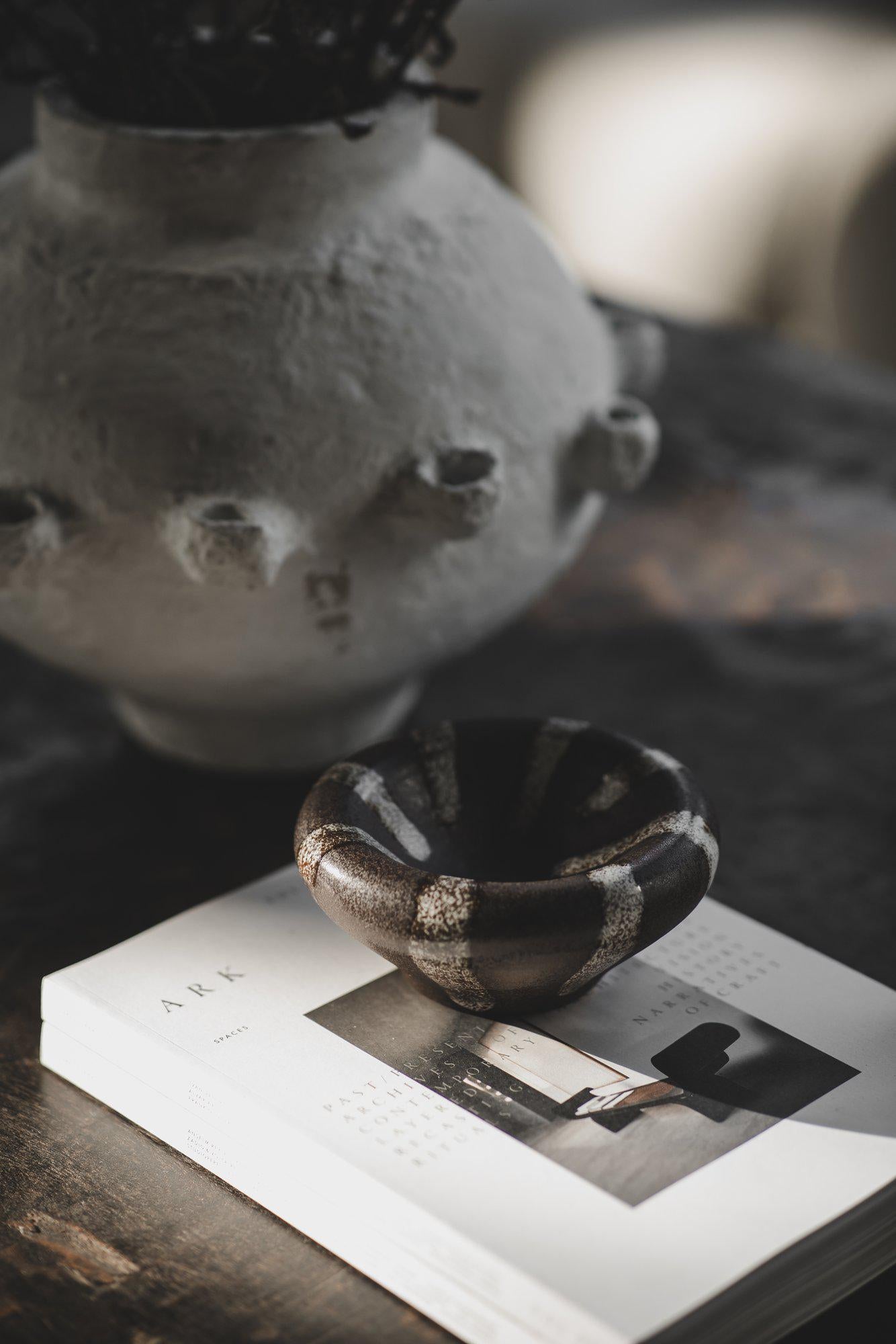 The Remi bowl is a decorative piece that exudes rustic charm and elegant beauty. With its brown and white stripes and soft, chunky shape, the bowl is a beautiful work of art that elevates any room. Hand-painted with a reactive glaze, each bowl has a unique appearance, with varying colors and finishes that make every piece one-of-a-kind. The rich depth and vibrancy of the glaze gives the bowl an authentic, handmade feel. With its rustic finish and soft design, Remi is more than just a bowl - it’s an interior detail that adds both warmth and character to your home. Perfect as a decorative element on the table, shelf, or as part of your collection of beautiful objects. The bowl is not foodsafe, making it ideal as a stylish decorative item for displaying small trinkets or creating a beautiful visual effect on shelves or tables. Let Remi be a unique and artistic addition to your home, bringing authenticity and a lively atmosphere to your space.