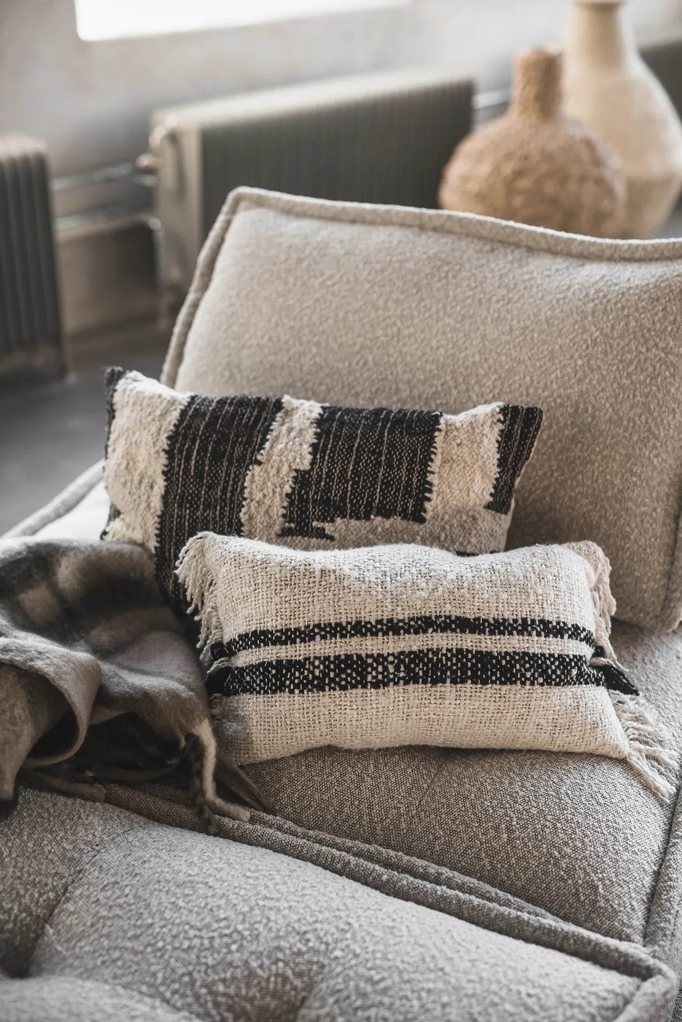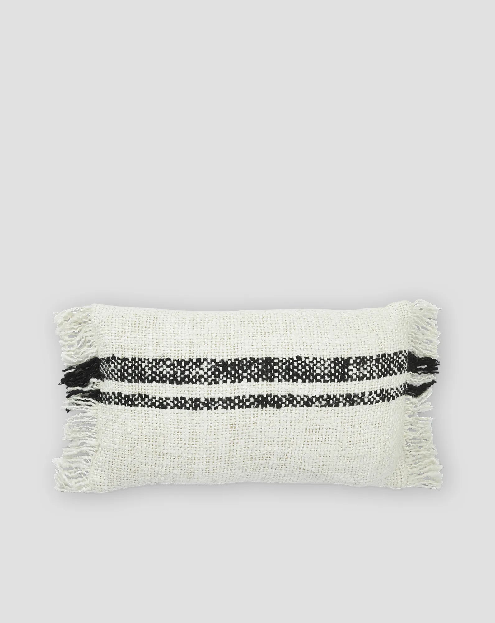 With its dimensions of 30x50 cm, the Willa Fringe cushion cover becomes a striking detail to enhance your home decor. The enchanting combination of cream and black offers a timeless and versatile aesthetic that seamlessly blends with various styles. The black stripes crossing the cushion cover provides it with a minimalist and sleek design, making it easily combinable with many other cushion covers. The handwoven cushion cover showcases a beautiful craftsmanship and care in every thread. Each fringe is thoughtfully placed, creating a subtle yet playful border around the cover. This handmade touch gives Willa Fringe a unique character, turning each piece into a masterpiece of skilled work. Crafted from a soft blend of cotton and viscose, Willa Fringe provides not only visual delight but also a tactile experience of superior comfort. The cushion cover is not just a decorative detail but also an inviting place to rest your head and unwind. Care instructions: Dry clean only.